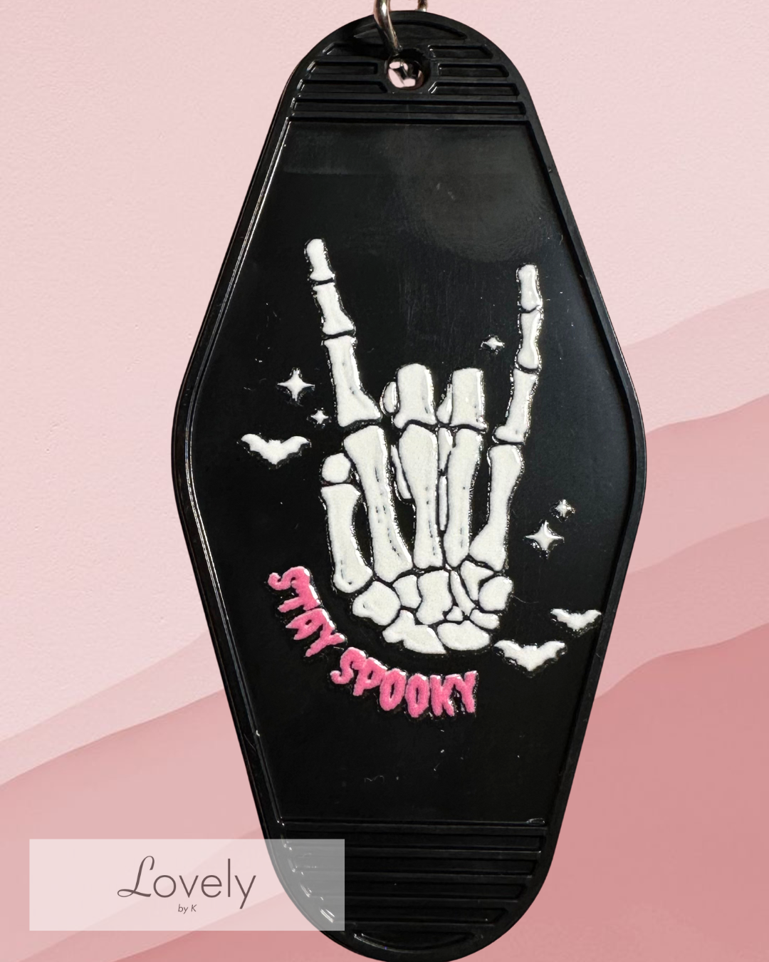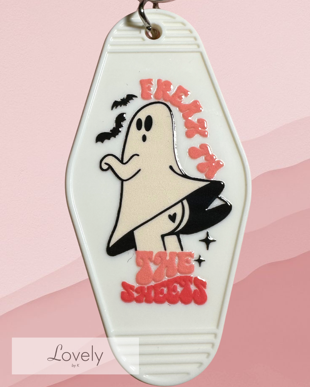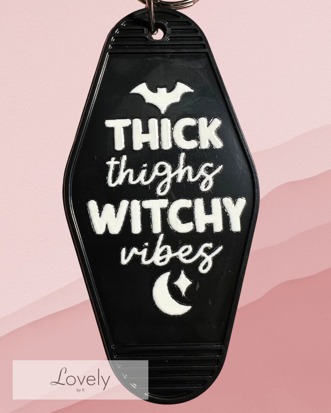 Vintage vinyl motel keychain with uvdtf print, one side.